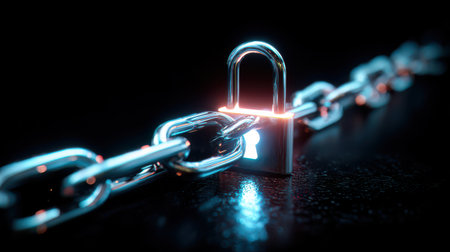 Secure Lock on a Metallic Chain with Glowing Highlights in a Dark Environment for Symbolizing Safety and Protection in Digital or Physical Spaces