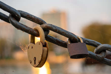 Rusty lovers locks on a chain on a bridge, lovers locks on a bridge chain