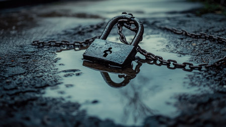 A padlock and chains reflecting in a puddle on the ground, showing duality and mystery in a gloomy setting.
