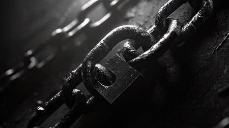 Close-up of padlock and chains on a black background, with spotlight emphasizing strength and security.