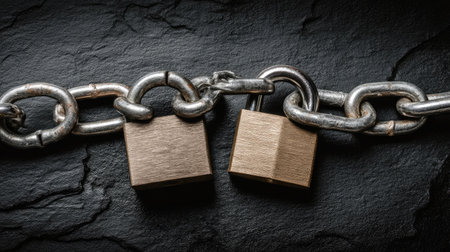 Close-up view of strong metal chain links connected by two closed padlocks, showcasing durability and security on a dark, textured surface. Perfect for themes of protection.