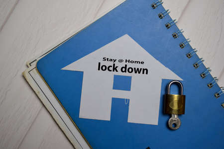 Stay at home and Lock Down write on a home made from paper isolated on Office Desk.