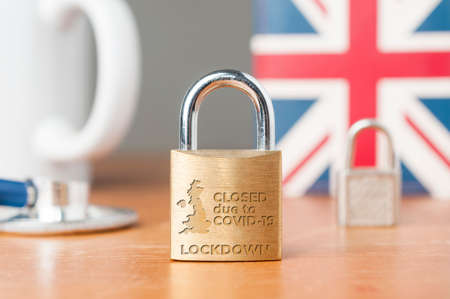 Covid-19 UK lockdown concept. A lock with the message close due to covid-19 lockdown on a wooden table with Union Jack on the background, a mug and a stethoscope.