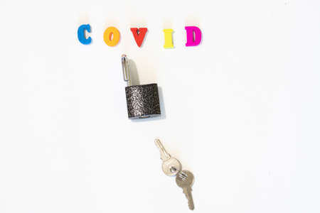 Open padlock with keys on a white background. Country Border Opening Concept. Word COVID made with letter board. Coronavirus is a pandemic virus