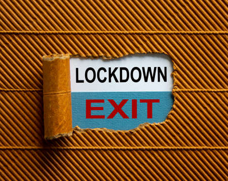 The text 'lockdown exit' appearing behind torn brown paper. Business concept.