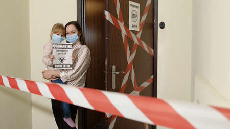 Sick mother with kid daughter in medical masks holding inscription text, opening entrance corridor door with warning sign. Family of woman and child girl during coronavirus quarantine lockdown at home