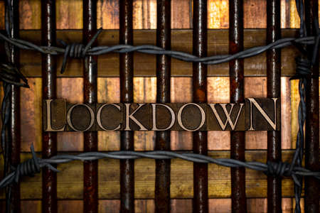 Lockdown text formed by real authentic typeset letters on vintage textured rusty grunge nails with barbed wire on bronze copper and gold background