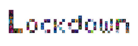 Collage of portraits of 22 young emotional people on multicolored background in neon light making Lockdown lettering. Concept of healthcare and medicine, coronavirus pandemic outbreak, lockdown.