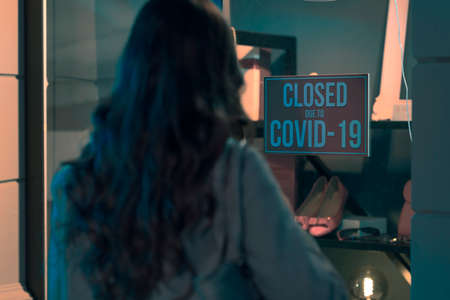 Store closed due to coronavirus pandemic and woman standing in front of the store window