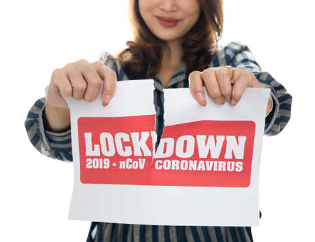 Woman holding and tearing paper with Covid-19 lock down announce words. The idea or concept for the ending, happiness and free after finishing and recovered from Coronarivus, on white background.