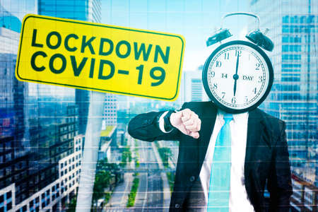 Double exposure of businessman with head of alarm clock looking at his wristwatch while standing with locdown covid-19 text on yellow signboard