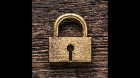 A closeup of a vintage brass padlock resting on a rustic wooden surface, symbolizing security, safety, and antique craftsmanship, ideal for various concepts.