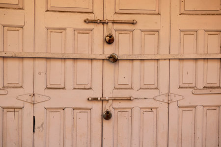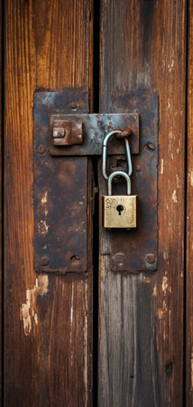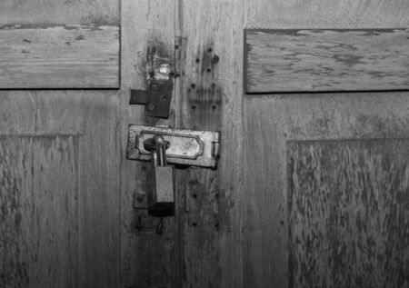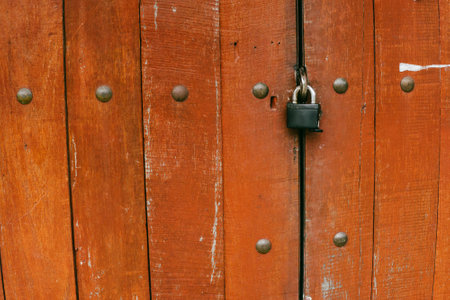 antique wooden door locked with old padlock