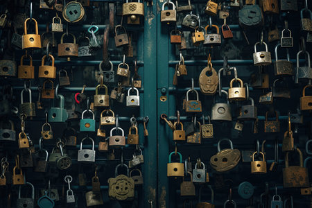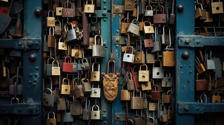 Numerous locks and security devices hang on a city door, highlighting concerns about safety and access control.