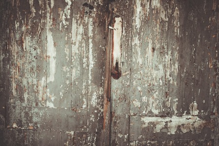 old shabby door painted with smudges of gray paint is closed on a padlock, one handle is torn off