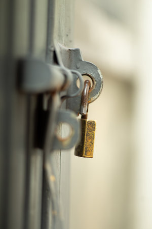 A small, weathered brass padlock is used to secure an old, rusty metal slide bolt on a blurred background. The image emphasizes security, age, and forgotten places with a shallow depth of field.