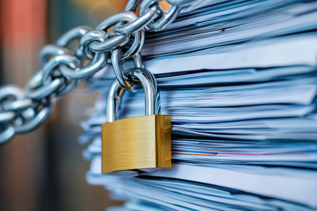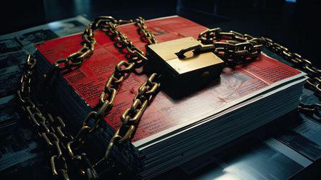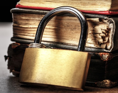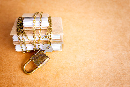 Stack of tiny books wrapped with chain and secured with a keyed padlock isolated on a craft paper background with copy space. Creative sensitive data protection concept.