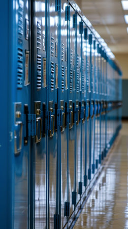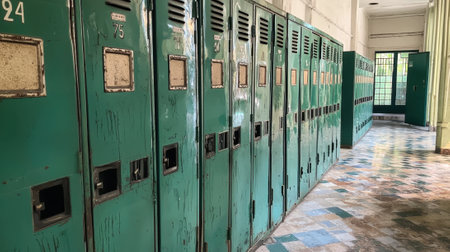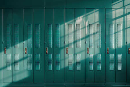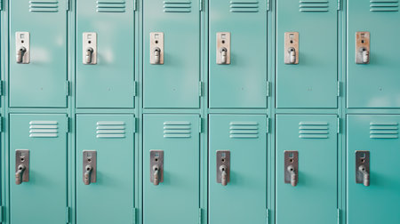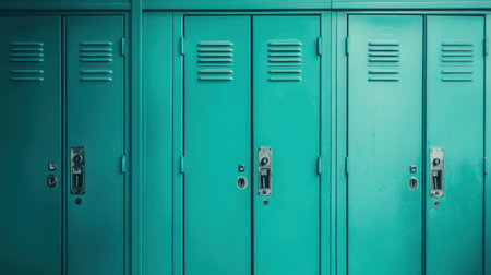 A vibrant scene featuring a row of turquoise metal school lockers, offering a unique glimpse into educational spaces filled with character and nostalgia for school life.