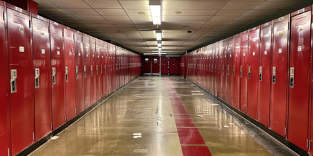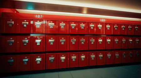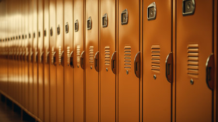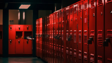 Row of red lockers in school locker room. Shallow depth of field.generative ai