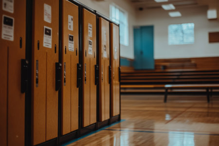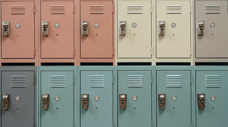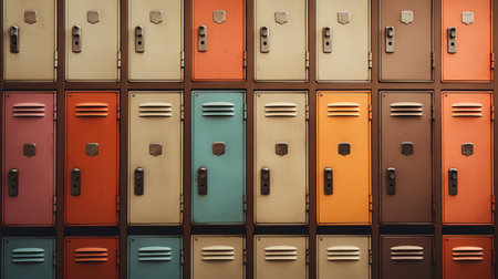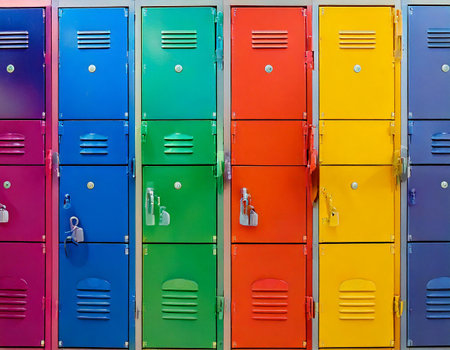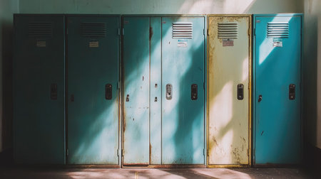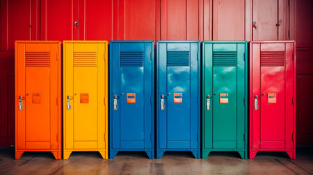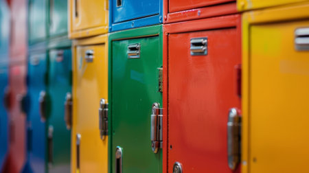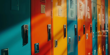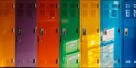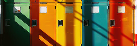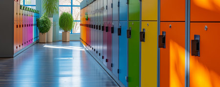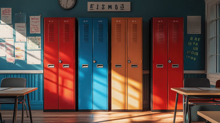 A row of colorful school lockers in a hallway, lit by warm sunlight, symbolizing education and student life. High quality photo