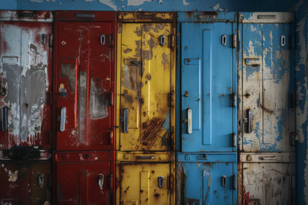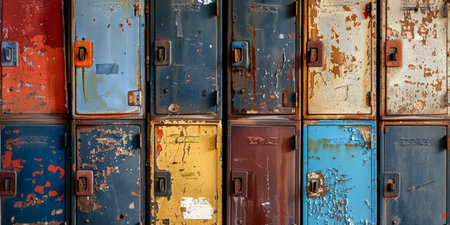 This image features a row of vintage rusty lockers in an abandoned industrial setting. The peeling paint and weathered finishes evoke a sense of nostalgia and decay, perfect for creative projects.