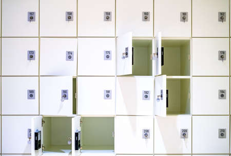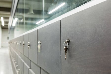 Many wooden lockers with keys and numbers on doors. Vignette effect