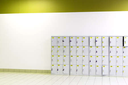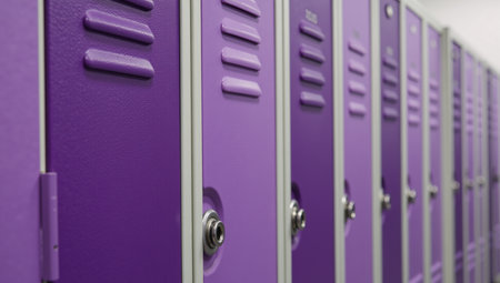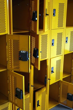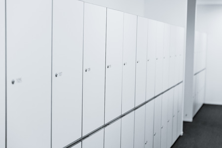Row of colorful lockers in school locker room. Shallow depth of field.