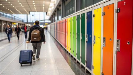 A vibrant row of colorful travel lockers in an airport or train station, showcasing a lively travel environment.