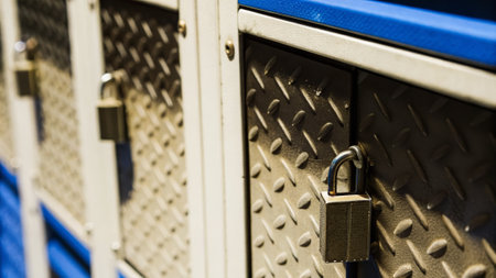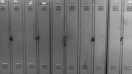 Close-up view of locked gym lockers with textured metal surfaces, ideal for fitness and gym-related imagery.