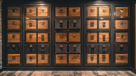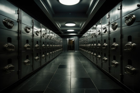Interior of a modern locker room with doors and lockers, lockers in a bank in a vault, AI Generated