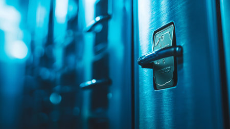 A detailed shot of a metallic locker handle under blue lighting, representing security, privacy, and protection, often associated with banking or safekeeping.