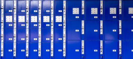 Yellow numbered lockers for storing visitors. Security locker. Luggage storage at the train station. Storage cells for personal belongings. Key-type safe storage cabinet. Storage box in public place.