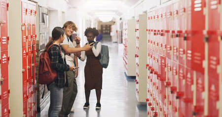 Friends make school extra fun. a group of teenagers using a smartphone in the corridor of a high school.