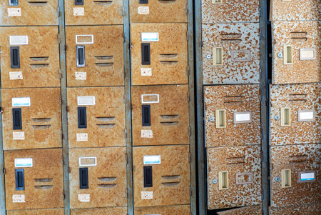 A close-up view of weathered metal lockers featuring rust marks and a textured surface. Ideal for themes of aging, storage, and industrial design.