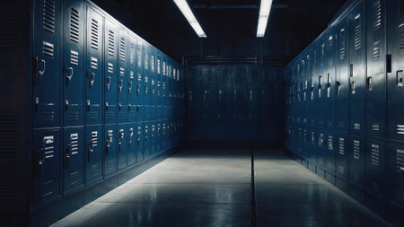 moody scene inside a locker room, with rows of blue metal lockers and overhead fluorescent lighting casting dramatic shadows on the polished concrete floor, creating an industrial atmosphere.