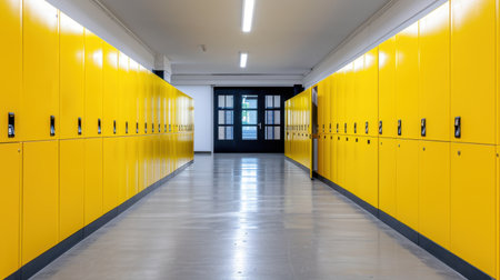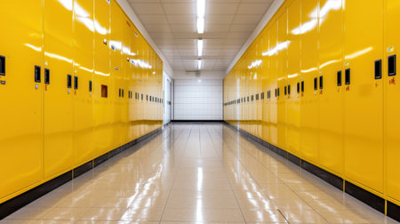 This image showcases a bright yellow locker hallway featuring an organized layout with reflective floors and modern design. Ideal for storage solutions.
