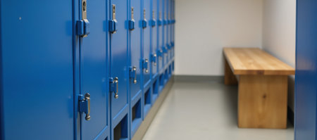 Blue metal lockers with wooden bench provide practical storage in locker area