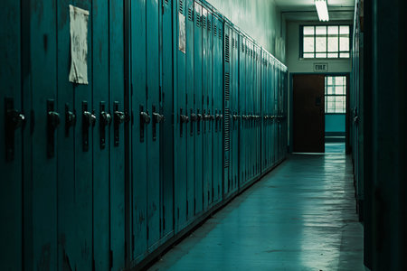 Row of teal lockers in an empty hallway creates a nostalgic and eerie atmosphere, with vintage doors and shadows adding to the spooky feel