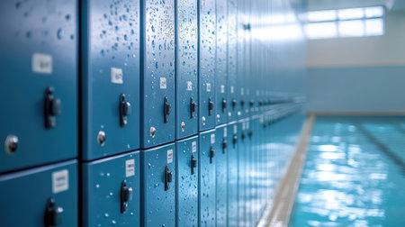 A view of blue lockers in an indoor swimming area, with water droplets on surfaces, adjacent to a gleaming swimming pool, promoting a vibrant and modern fitness environment.