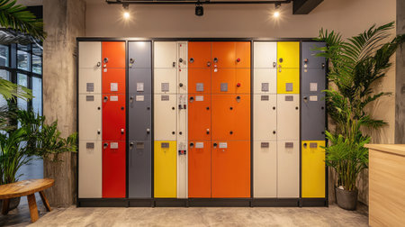 Full wall of multicolored lockers with sleek modern design in a public co-working space