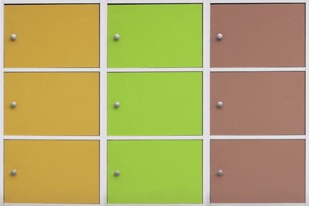 Front view of a stack of colorful metal school lockers with combination locks and doors.background