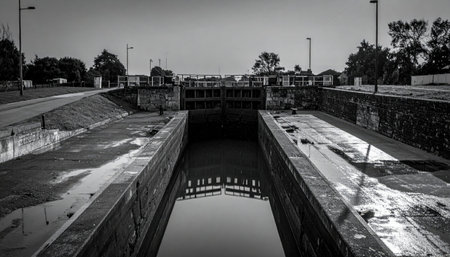Cinematic industrial photo of a dry canal lock at low gray light, wet concrete planes with subtle puddle reflections and hushed tonality.
