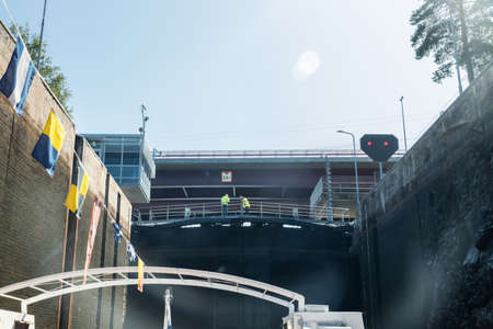 Lappeenranta, Finland - August 7, 2019: Lock and bridge on the Saimaa Canal at Malkia. Engineers are finding out the reason for the failure of the gateway. View from water.