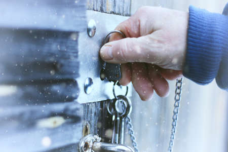 Close up of hand with key opening lock on the wooden door. High quality photo