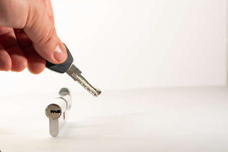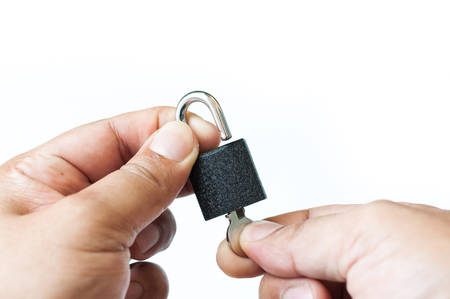 unlock a lock with key in man hand isolated on white background