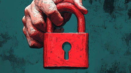 An illustration of a hand gripping a bright red padlock, symbolizing themes of security, protection, and safeguarding. The artwork conveys a strong sense of safety and trust.