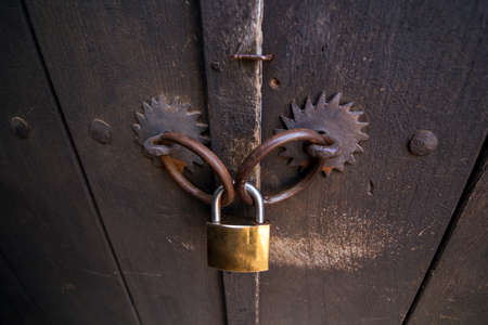old rusty lock on the vintage wooden door