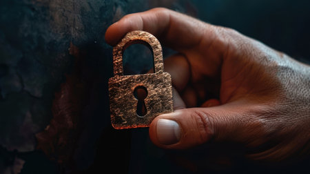 Hand holding vintage padlock against textured background, symbolizing security and protection. warm tones and intricate details evoke sense of nostalgia and mystery