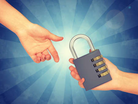Hand passingpad lock. Abstract blue background with stripes