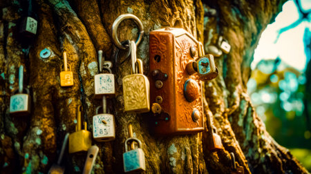 Bunch of padlocks are attached to tree in park. Generative AI.